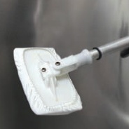 Autoclavable polyester mop system with low profile, swivel head and two fibreglass 46 cm and 61 cm handles facilitates cleaning of isolators, biosafety cabinets, glove boxes and laminar flow hoods.